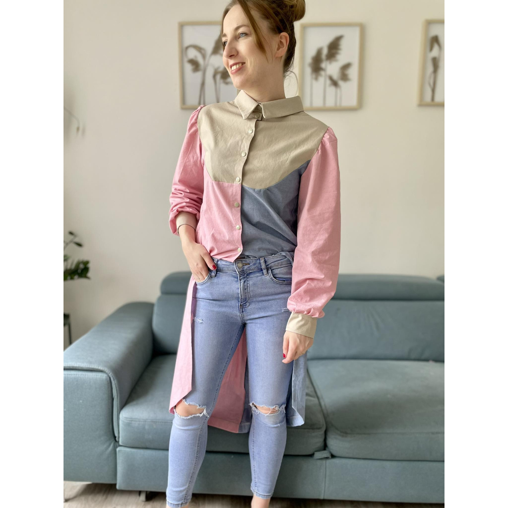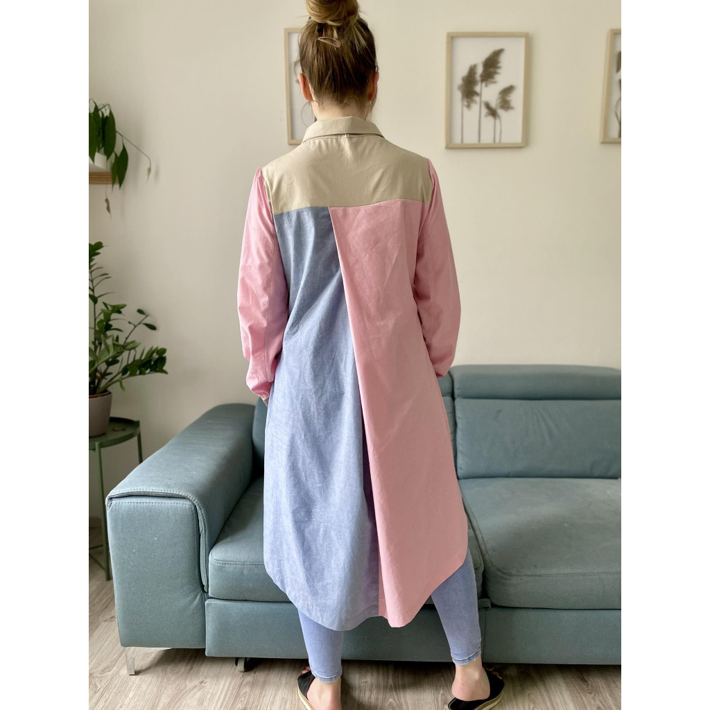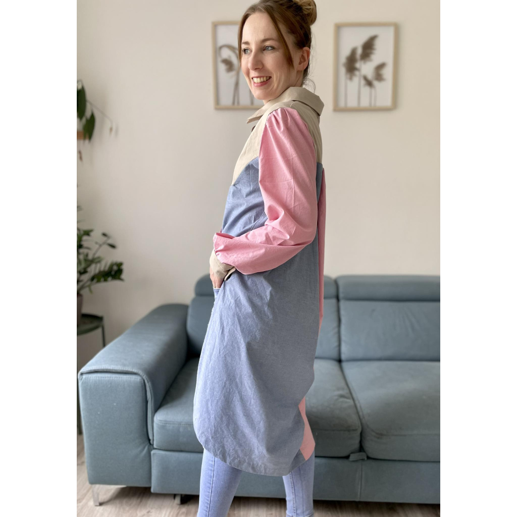 - Spotřeba materiálu (š.160 cm) : 0,4 m látky A (na modelu béžová), 1,3 m látky B (na modelu růžová), 1,1 m látky C (na modelu modrá)