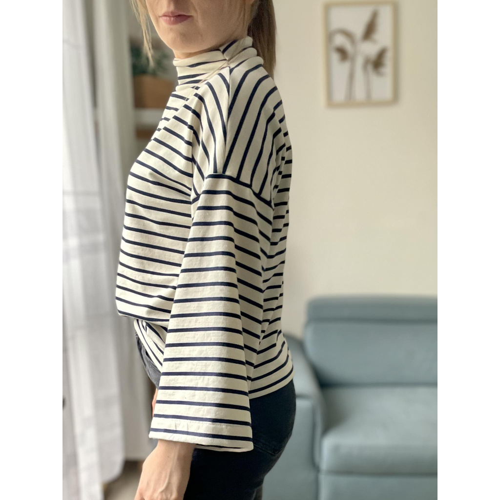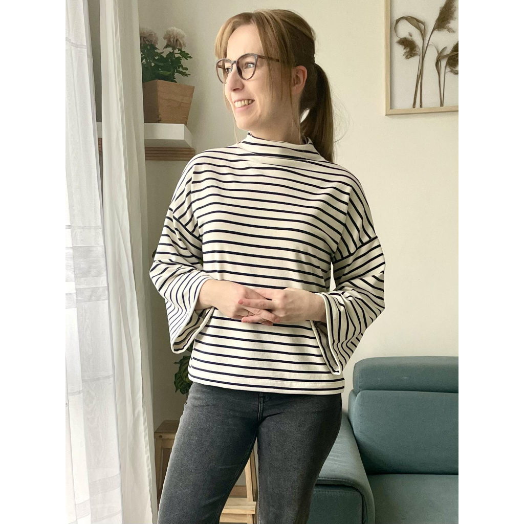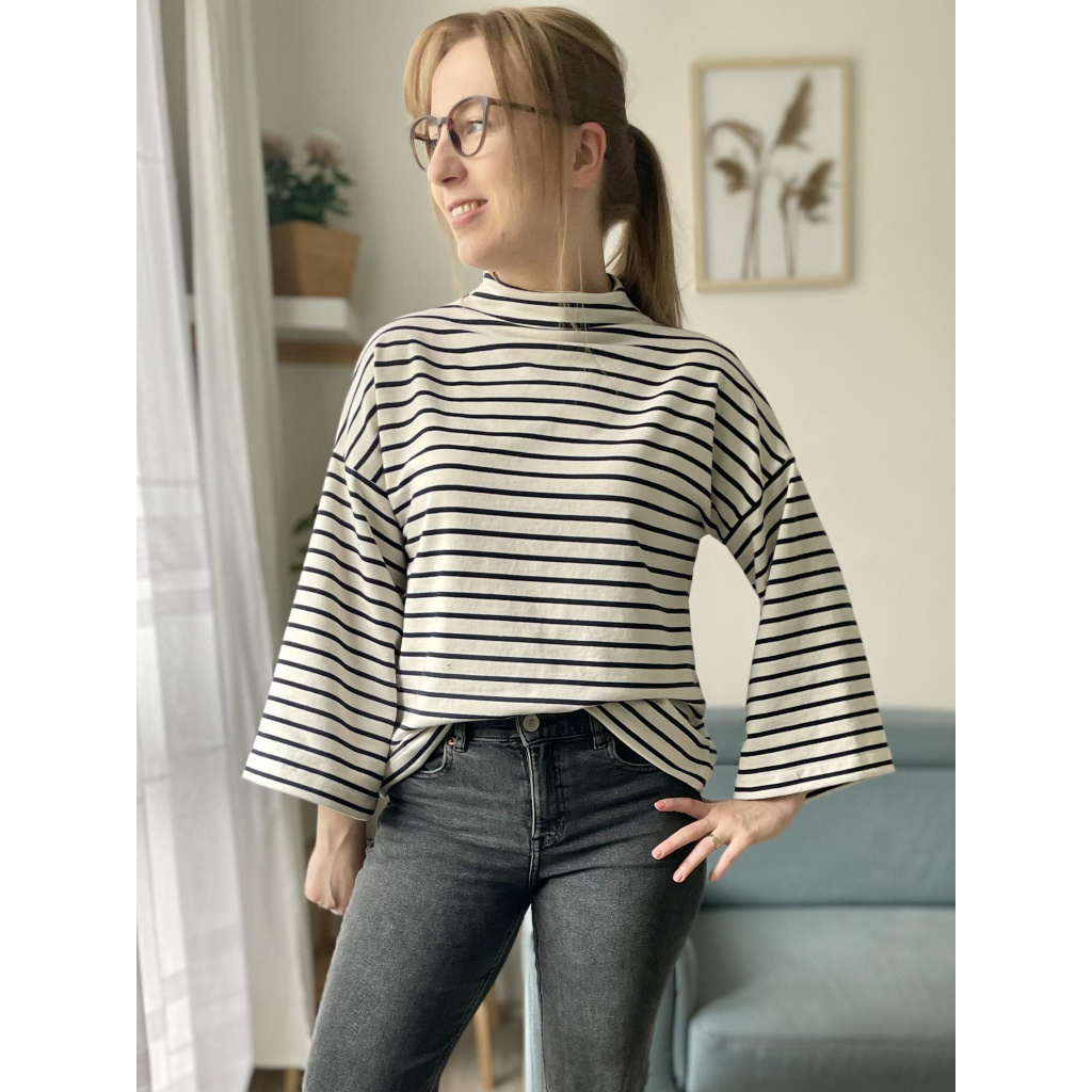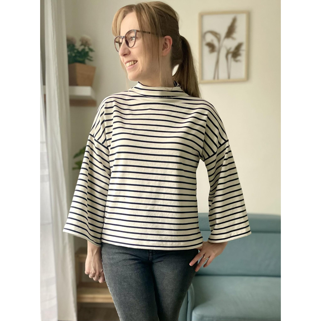 Střih na dámské tričko / mikinu se stojáčkem a zvonovými rukávy.