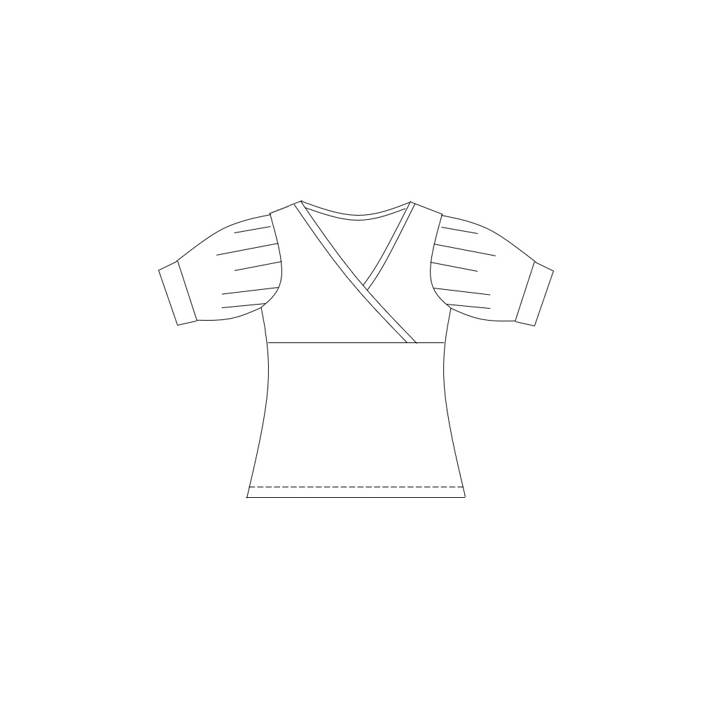 Střih na dámské křížené tričko s nabíranými rukávy.