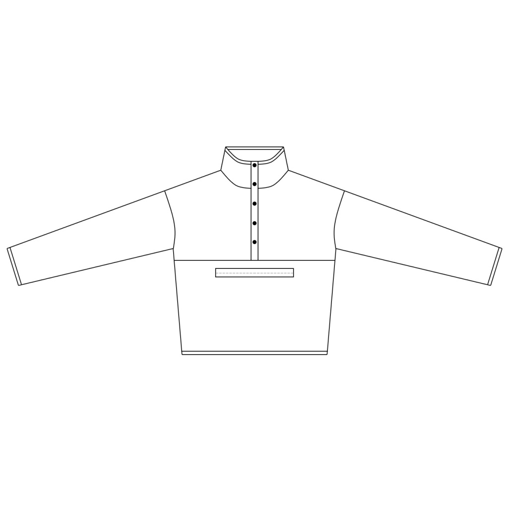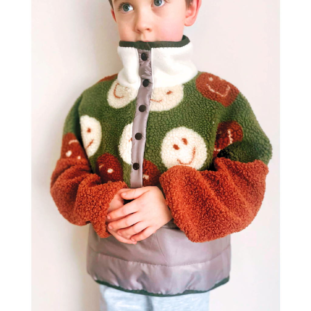 Střih na dětskou oversized mikinu / bundu s vysokým límcem, spadenými rukávy a kapsou ve velikosti 92-158.