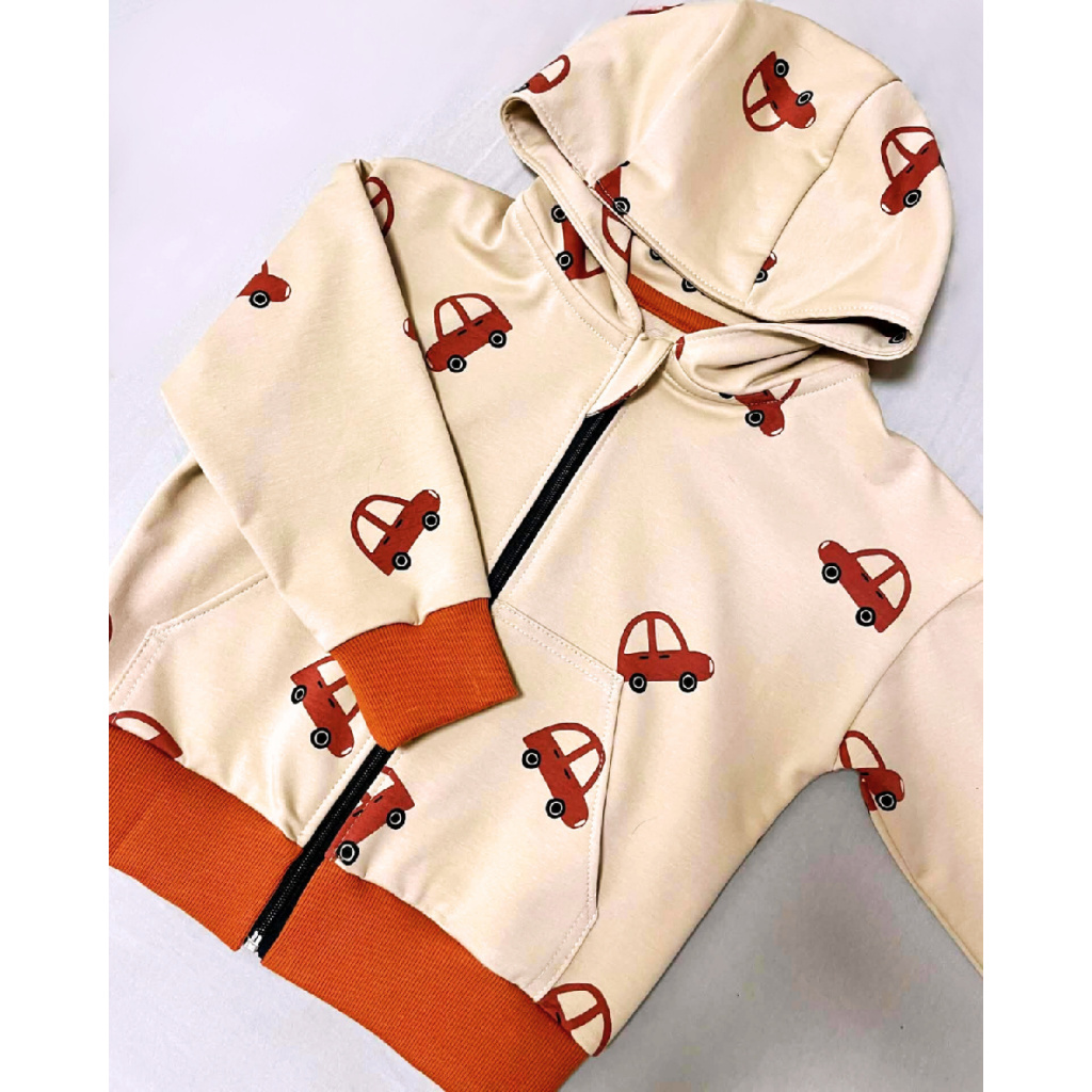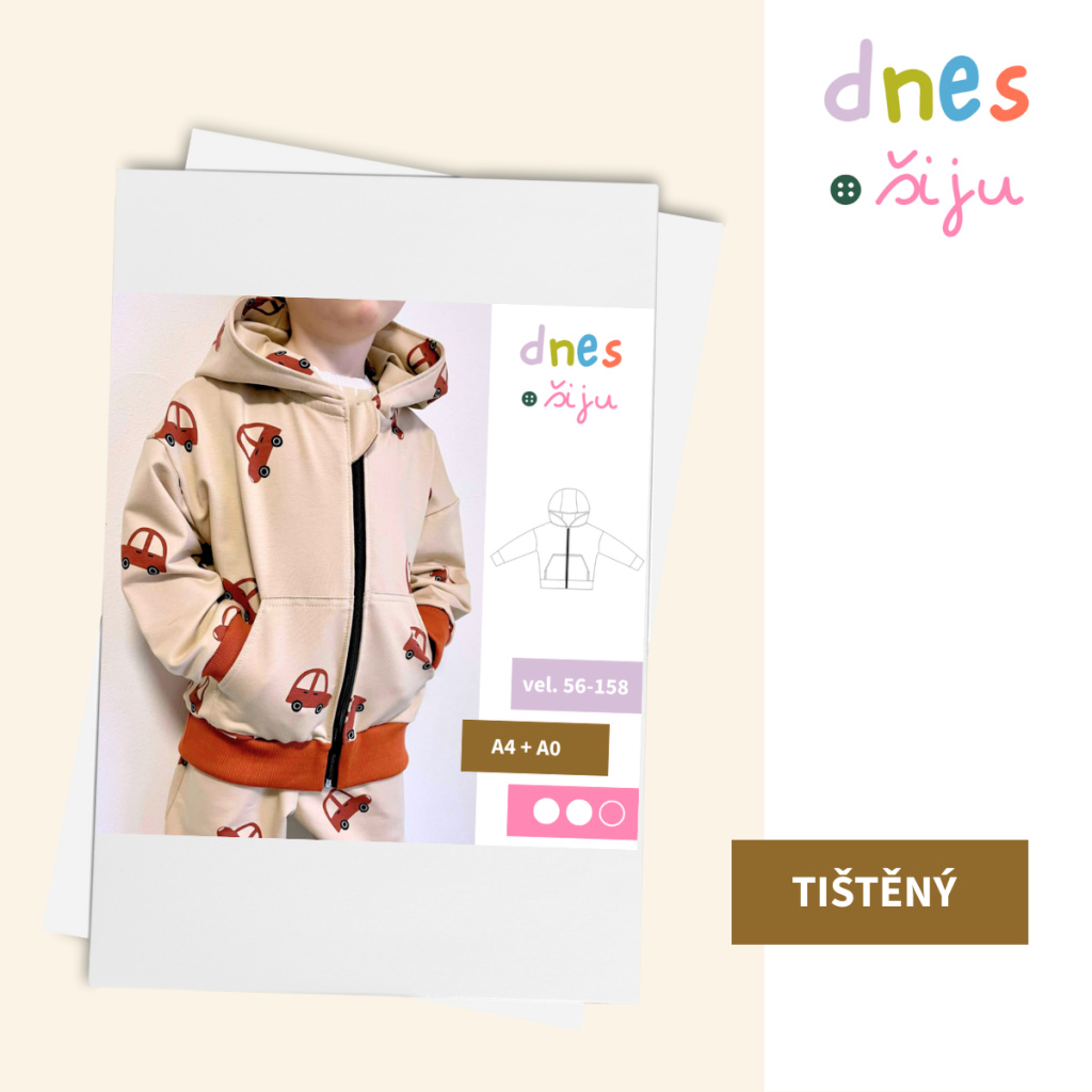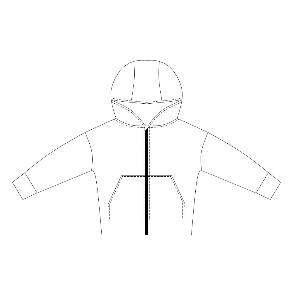 Střih na dětskou oversized mikinu na zip, s kapucí a kapsami ve velikosti 56-158.