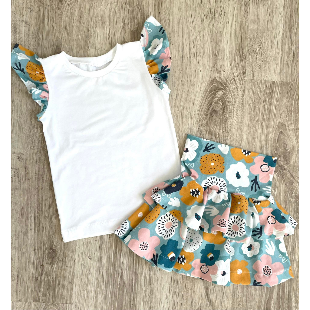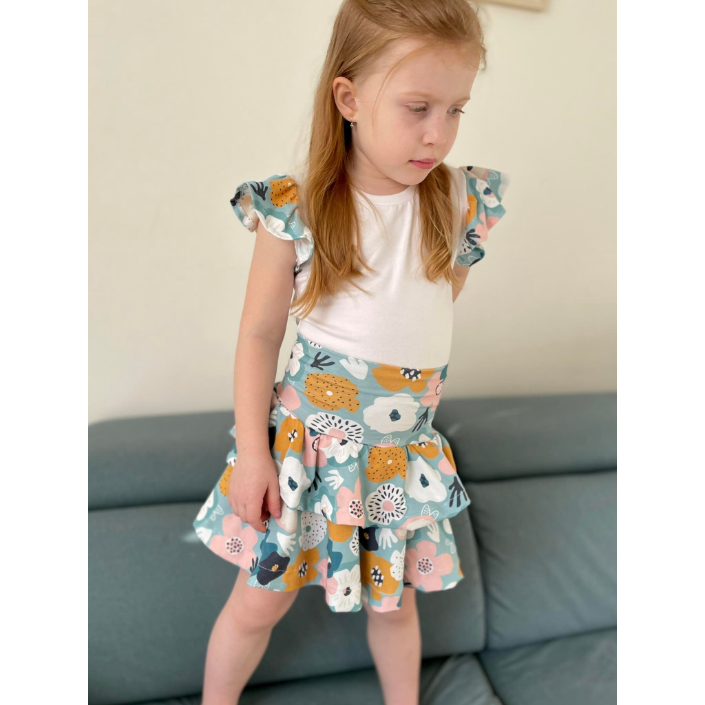 Střih na dětskou soupravu trička a sukně s volánky.
