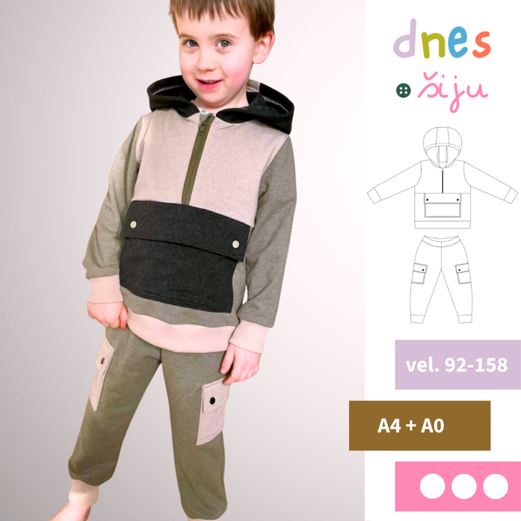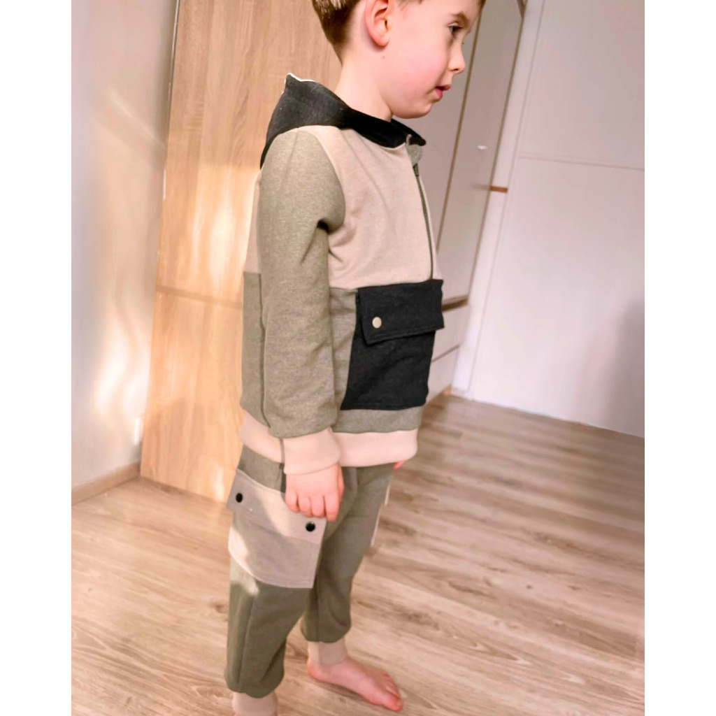 Střih na dětskou teplákovku kombinovanou z mikiny s polovičním zipem a velkou kapsou a z tepláků s bočními kapsami s klopami.
