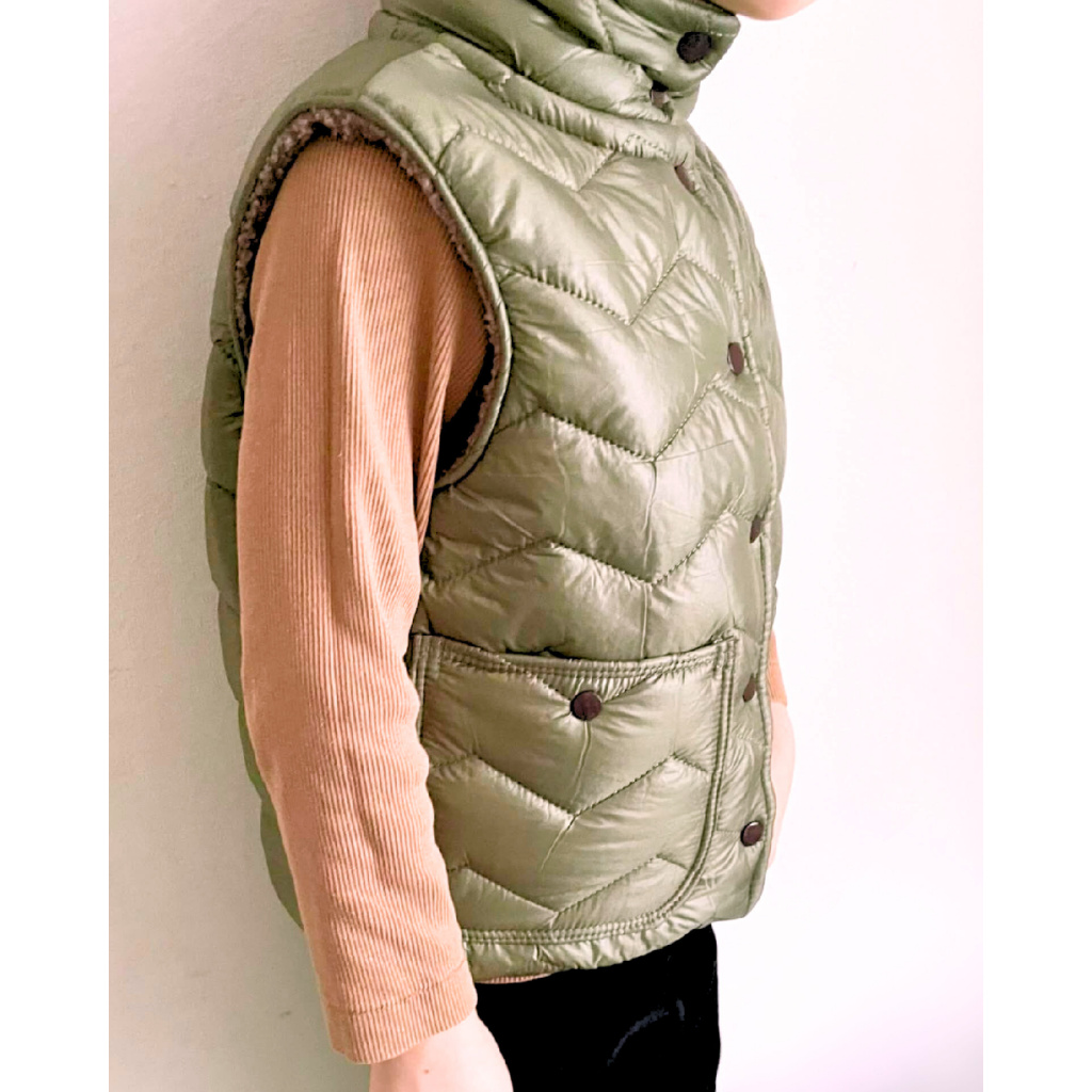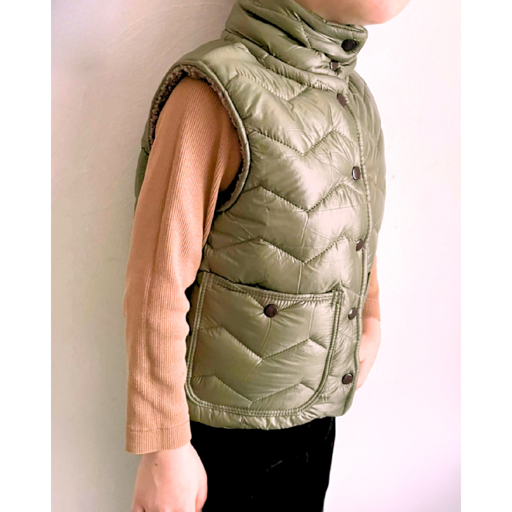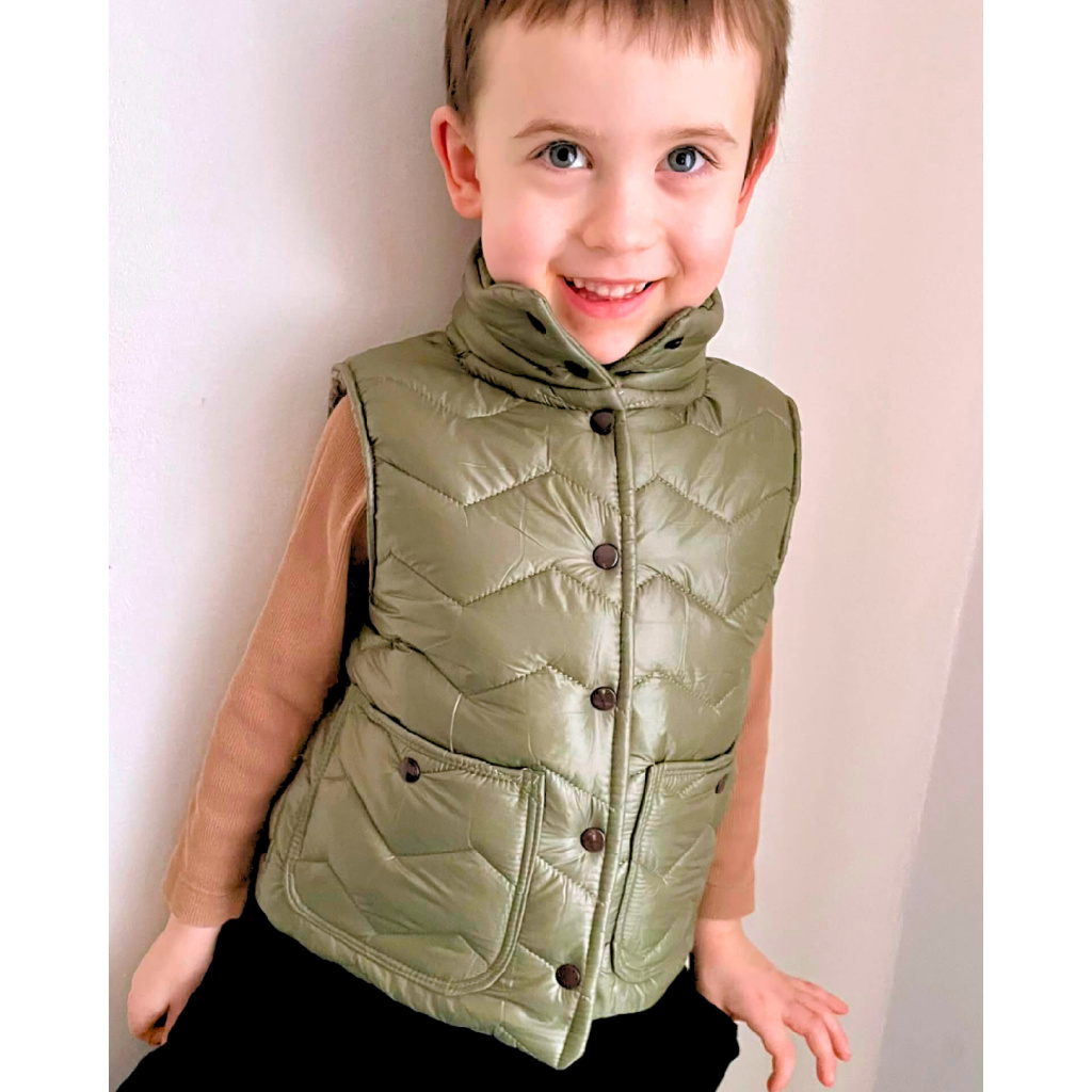 Střih na dětskou prošívanou vestu s podšívkou, stojáčkem a kapsami.