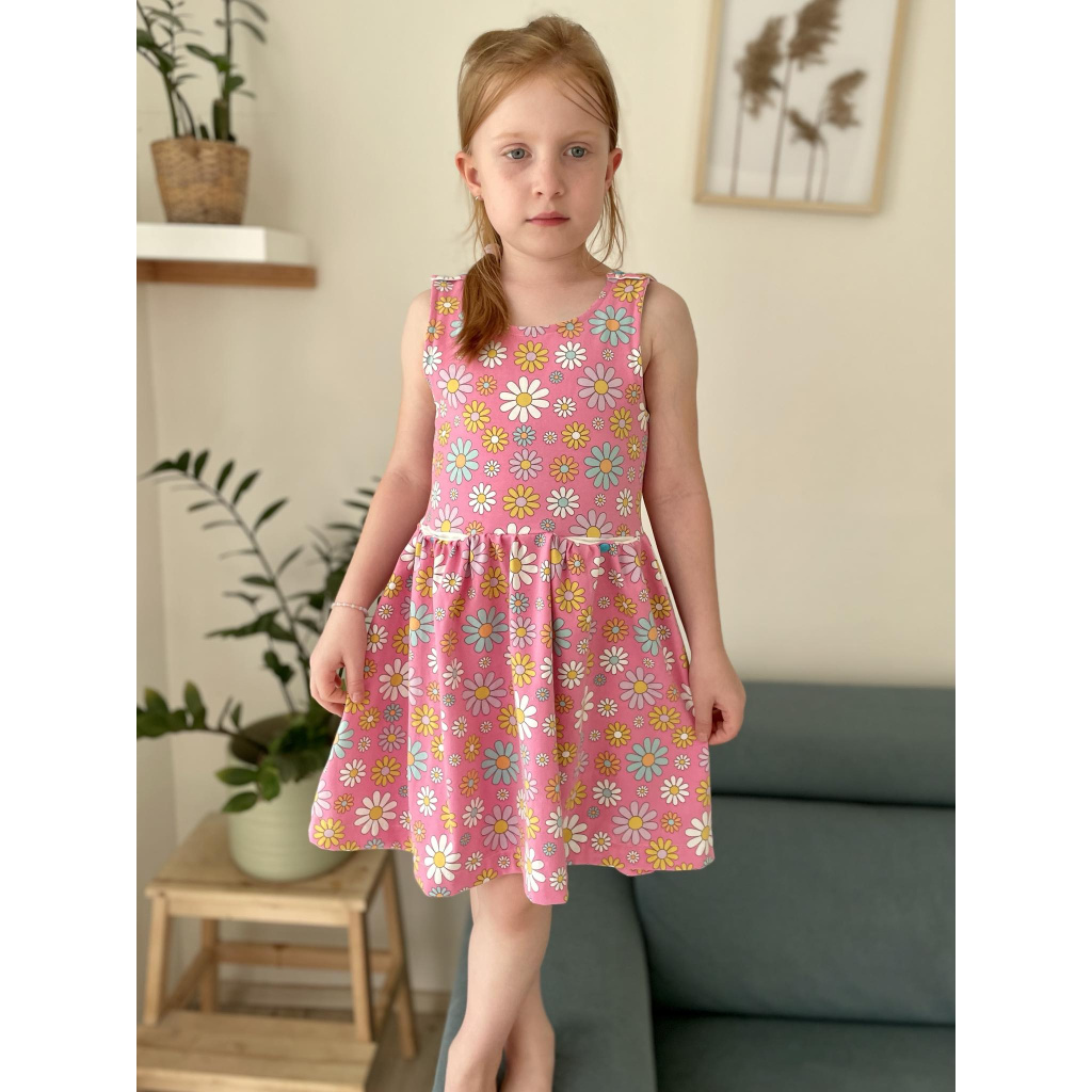 Střih na dívčí "zástěrkové" šaty se zapínáním na ramenou, řasenou sukní a kapsami.