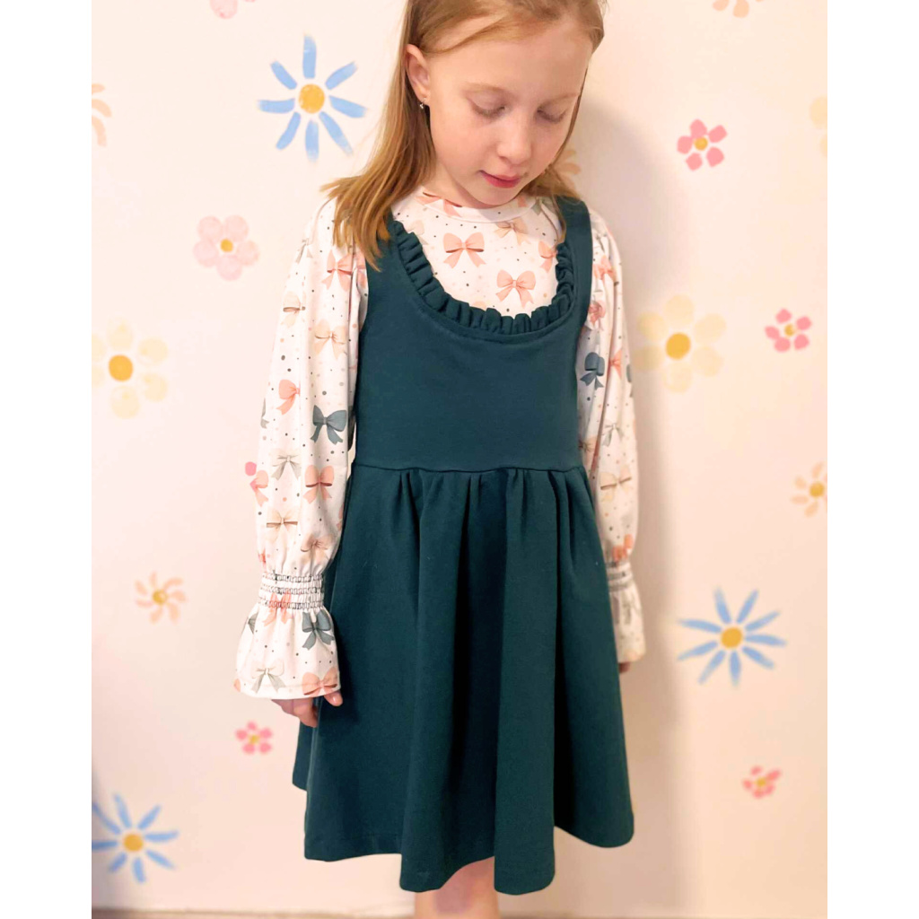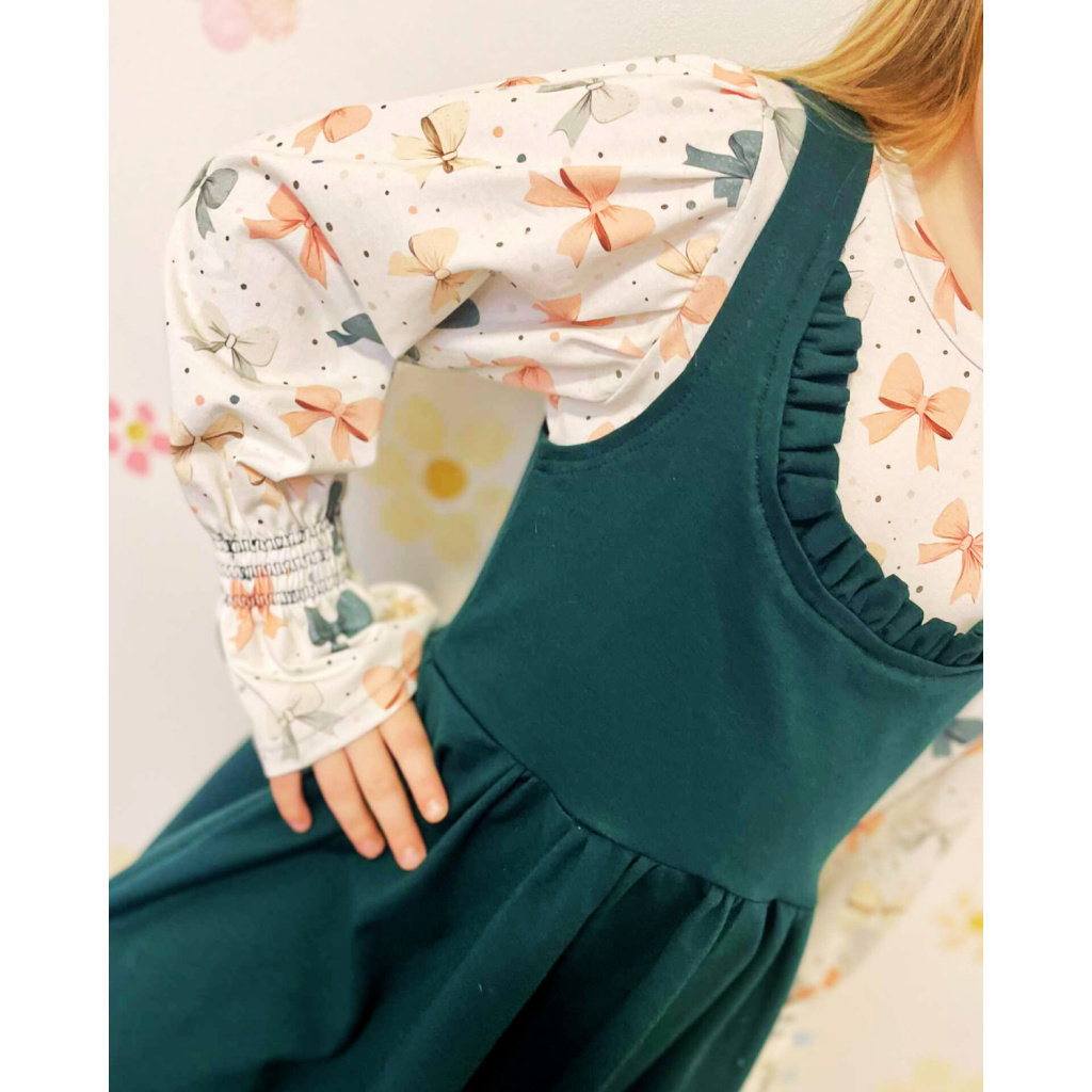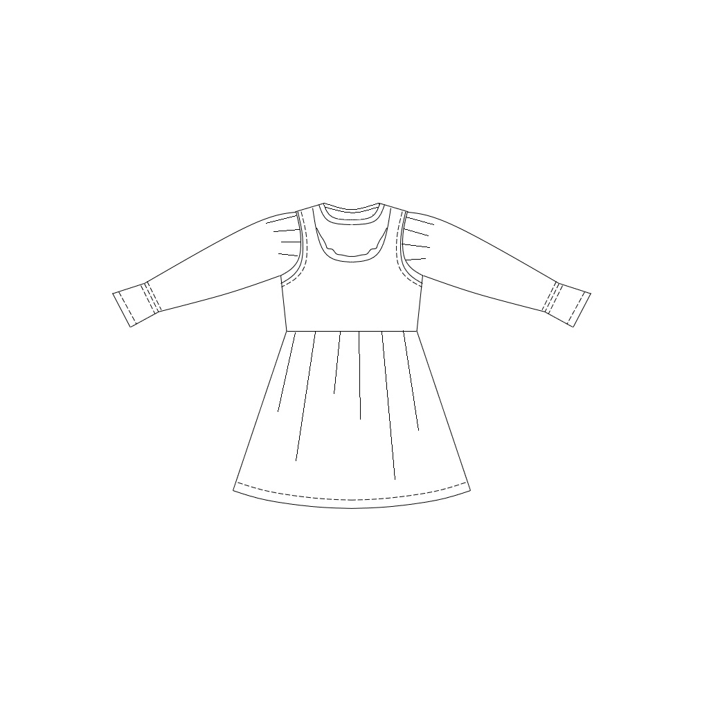 Střih na dívčí šaty s dvojitým vrškem, řasenými rukávy a řasenou sukní.