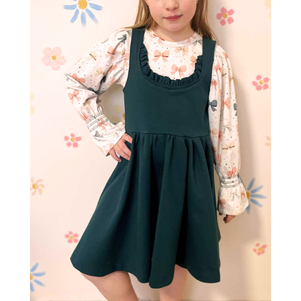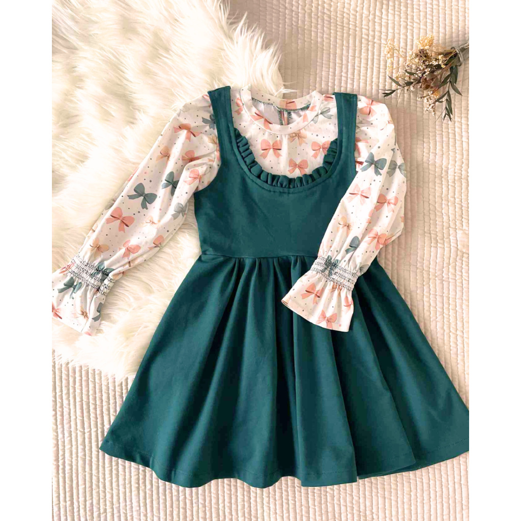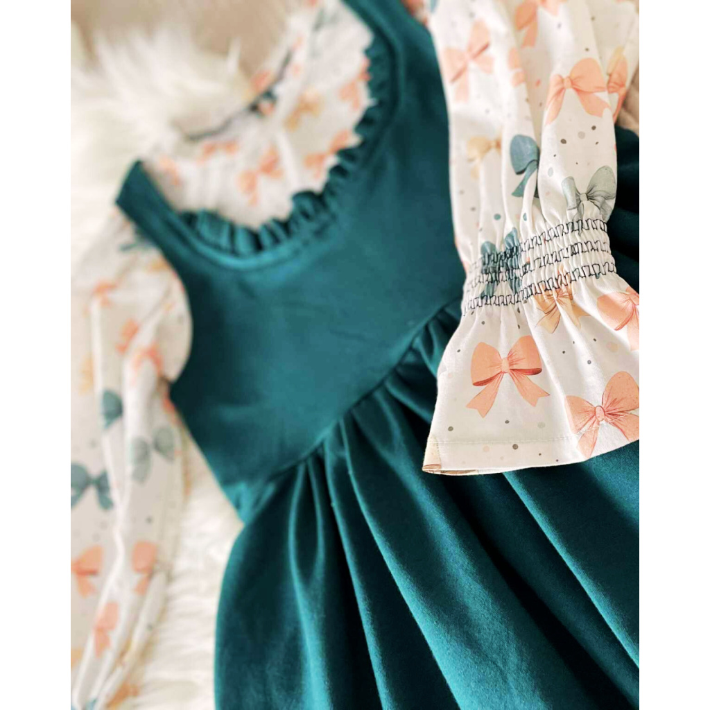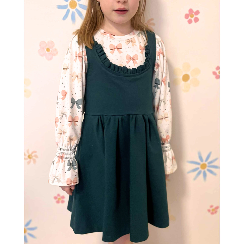 Střih na dívčí šaty s dvojitým vrškem, řasenými rukávy a řasenou sukní.