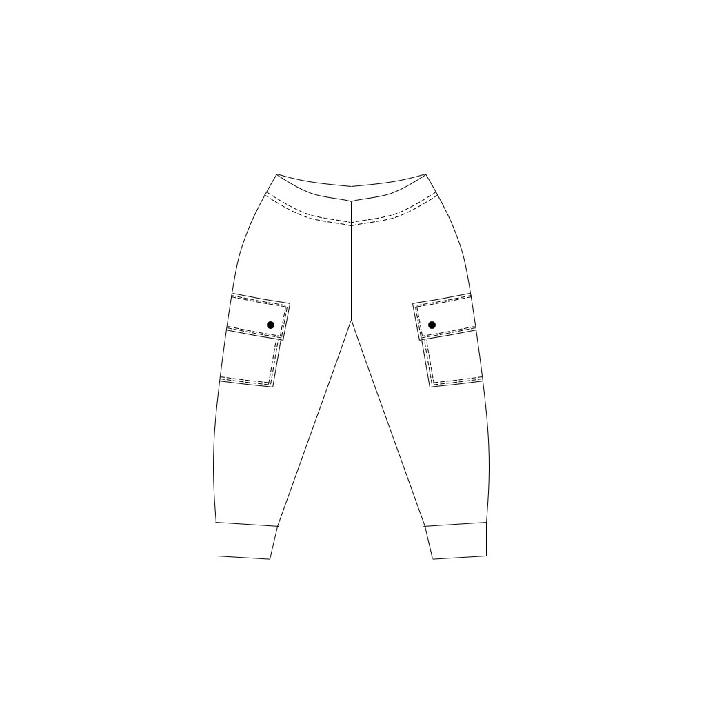 Střih na dětské tepláky s bočními kapsami s klopami ve velikosti 92-158.