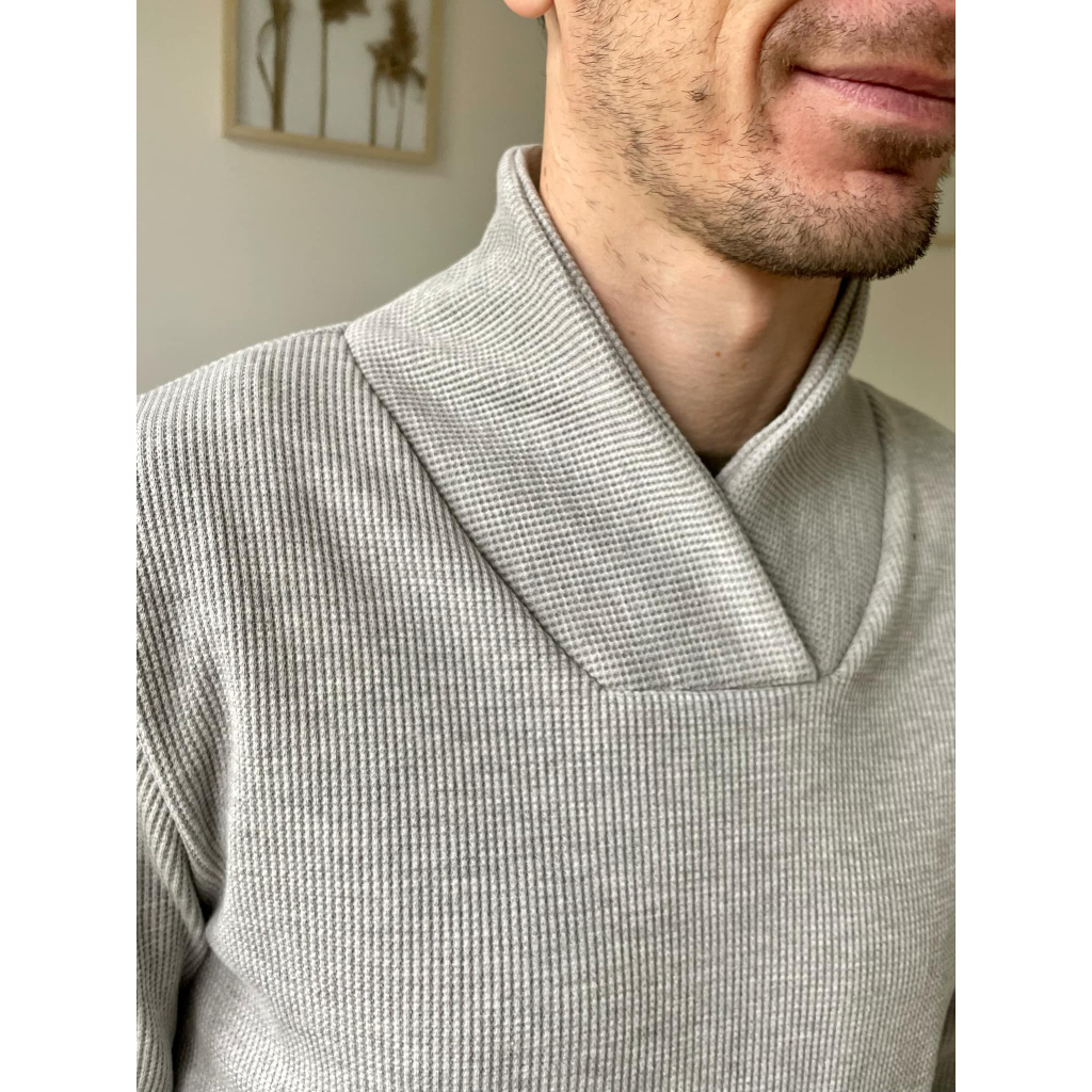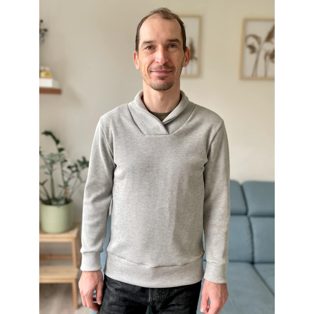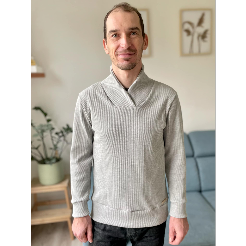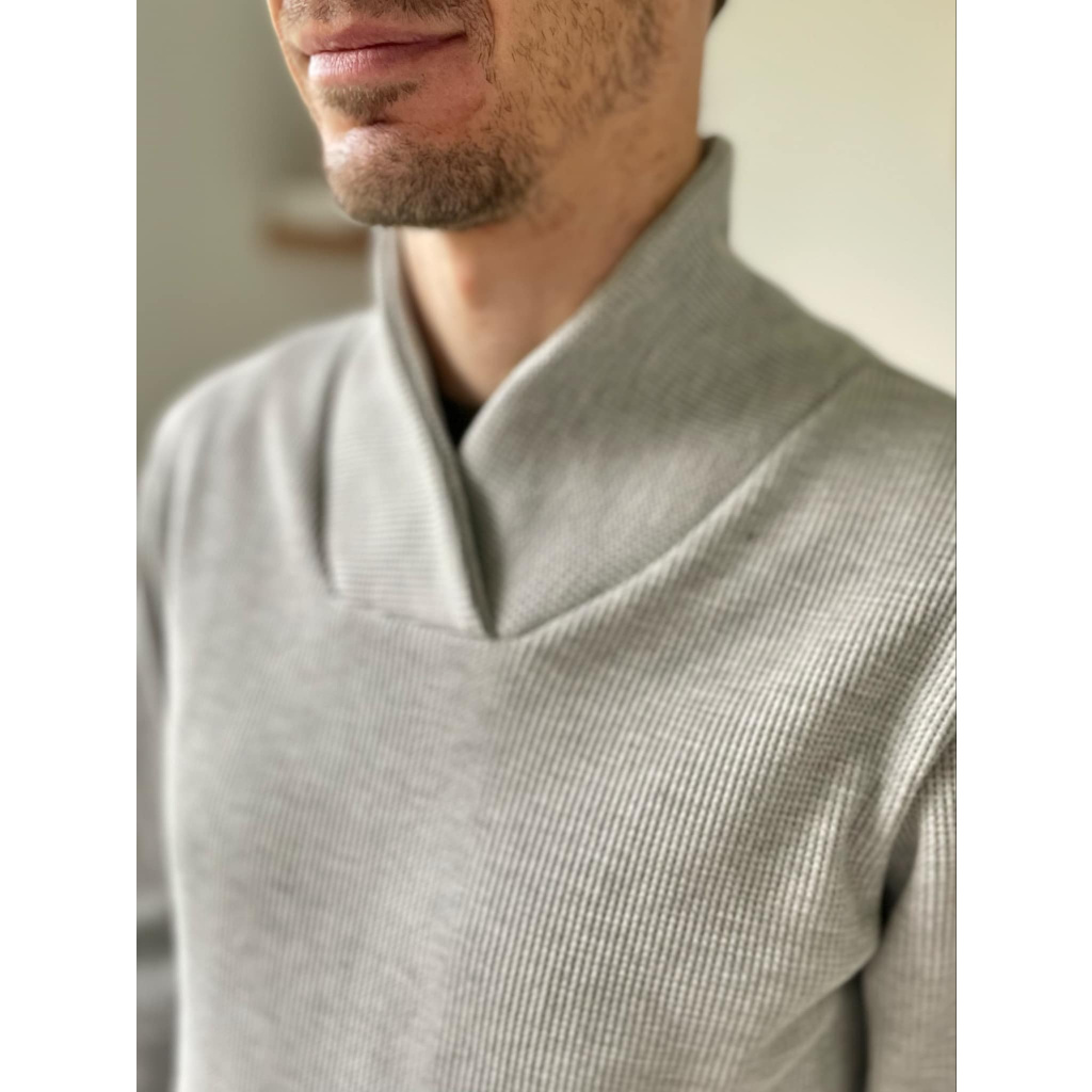 Střih na pánskou mikinu s vysokým kříženým límcem.